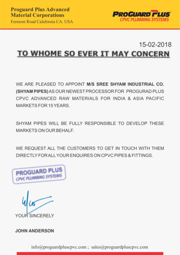 “ProGuardPlus® is dedicated to supplying the highest quality CPVC compounds to serve INDIA & ASIA Pacific hot & cold water plumbing markets". "Our partnership with highlights the need and importance of quality CPVC pipes and fittings made from time-tested CPVC compounds provided by ProGuardPlus®. Since April, we have been manufacturing these world quality materials. Our association with SHYAM PIPES will further strengthen ProGuardPlus®'s commitment to delivering reliability in India & Asia Pacific through SHYAM PIPE'S wide spread network through out the country."